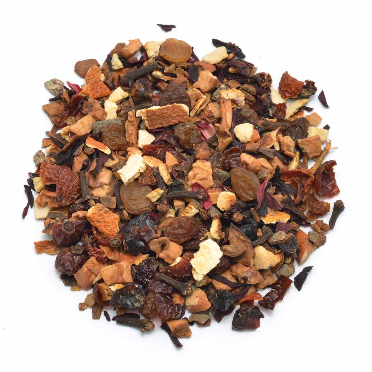 Zutaten: Apfelstücke (25%), Weinbeeren, Hagebutten, Zimt, Orangenschalen, Hibiskus, Gewürznelken, natürliches Aroma