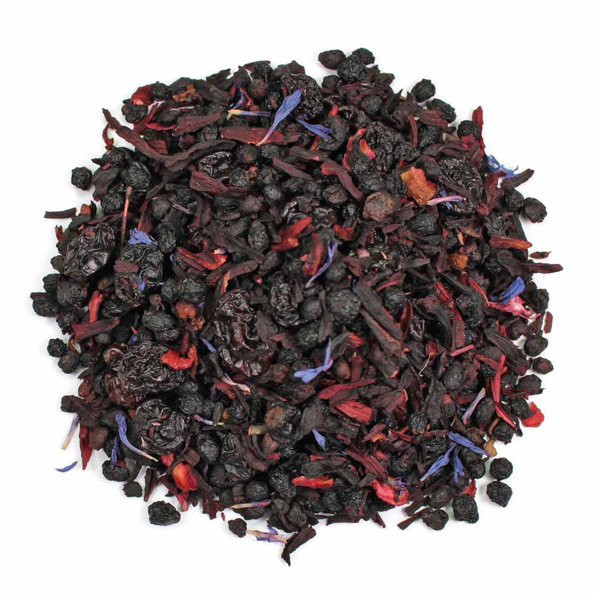 Zutaten: Beerenmischung (Holunder-, Wein-, Aronia-, Johannisbeeren) (66%), Hibiskus, Aroma, Kornblumen blau