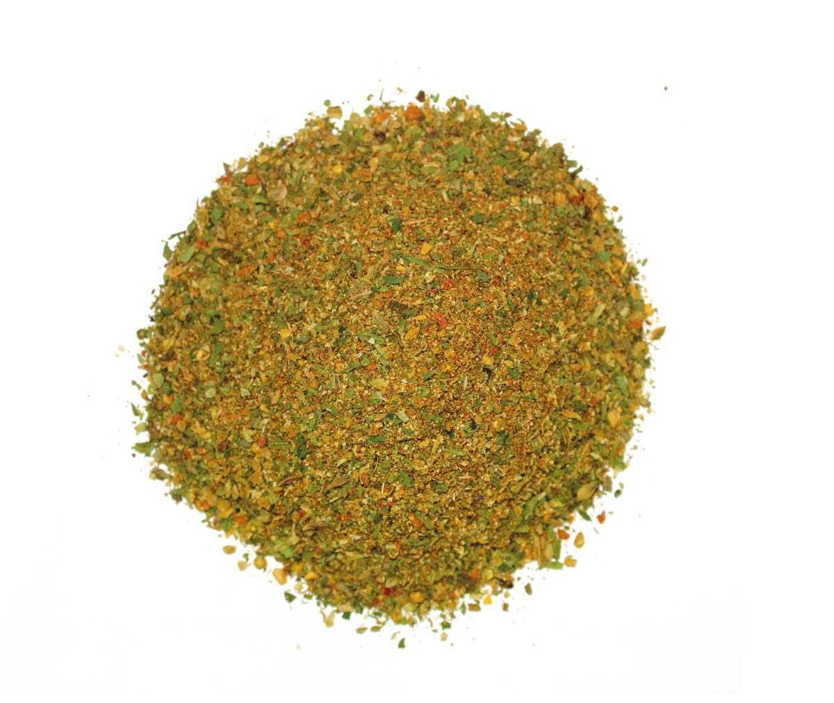 Zutaten: Petersilie, Schnittlauch, Zwiebel, Meersalz, Kurkuma, Knoblauch, Oregano, Majoran, Dillspitzen, Zitronenschalen, Liebstöckel