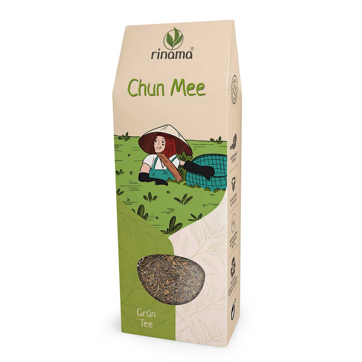 Dieser kräftige, anregende Grüntee aus China überzeugt durch eine überragende Qualität und helle Tassenfarbe. Er gehört zu den bekanntesten Teesorten Chinas und zeichnet sich durch sein kleines, leicht gerolltes Blatt und seine wohltuende Wirkung aus. Chun Mee kannst du pur oder mit Kandis genießen.