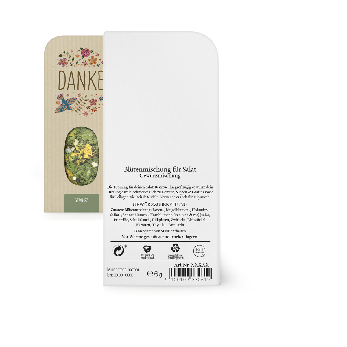 Zutaten: Blütenmischung (Rosen-, Ringelblumen-, Holunder-, Saflor-, Sonnenblumen-, Kornblumenblüten blau & rot) (22%), Petersilie, Schnittlauch, Dillspitzen, Zwiebeln, Liebstöckel, Karotten, Thymian, Rosmarin