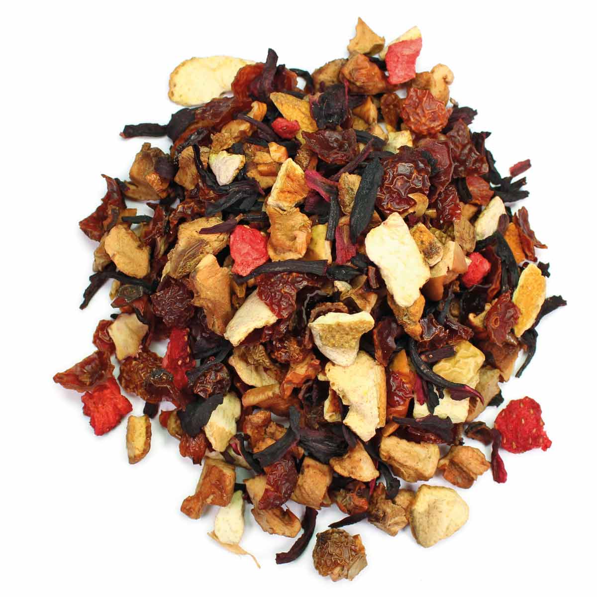 Zutaten: Apfelstücke, Hagebutten, Hibiskus, Orangenschalen (15%), Erdbeeren (3%), natürliches Aroma