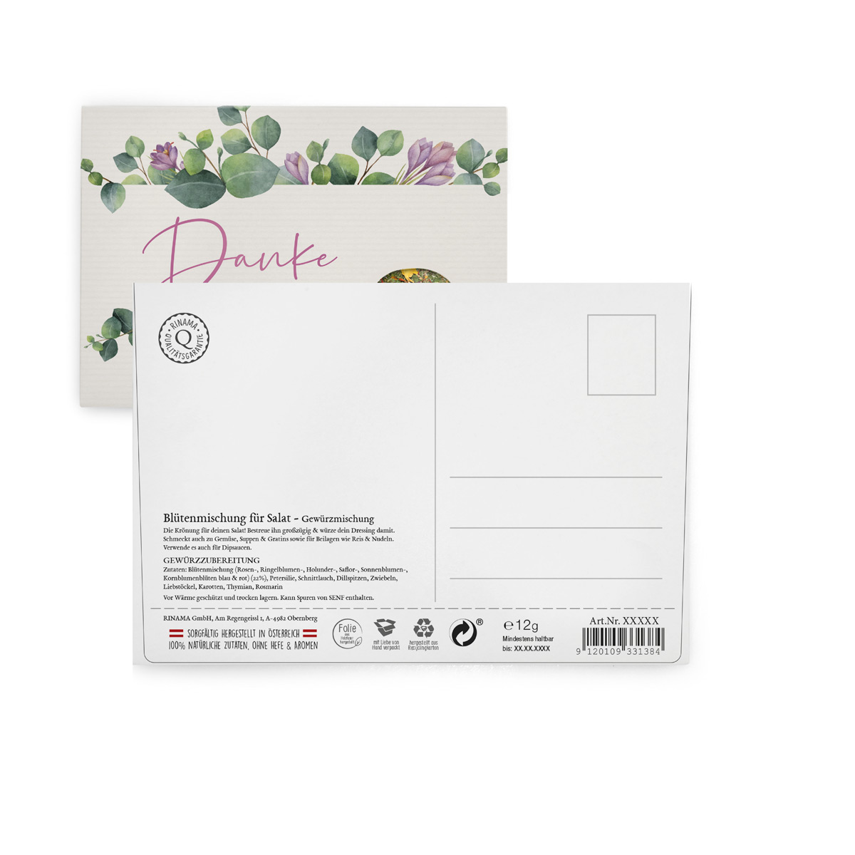 Zutaten: Blütenmischung (Rosen-, Ringelblumen-, Holunder-, Saflor-, Sonnenblumen-, Kornblumenblüten blau & rot) (22%), Petersilie, Schnittlauch, Dillspitzen, Zwiebeln, Liebstöckel, Karotten, Thymian, Rosmarin