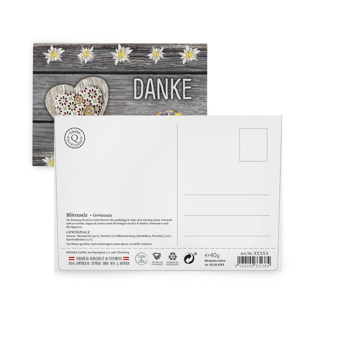 Zutaten: Meersalz fein (92%), Zwiebeln (5%) Blütenmischung (Saflorblüten, Petersilie) (2,5%), Karottenflocken (0,5%)
