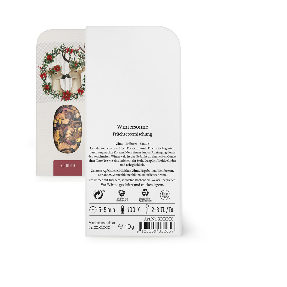 Lass die Sonne in dein Herz! Dieser exquisite Früchtetee begeistert durch ausgesuchte Zutaten. Nach einem Spaziergang durch den verschneiten Winterwald ist der Gedanke an den heißen Genuss einer Tasse Tee wie ein Streicheln der Seele.