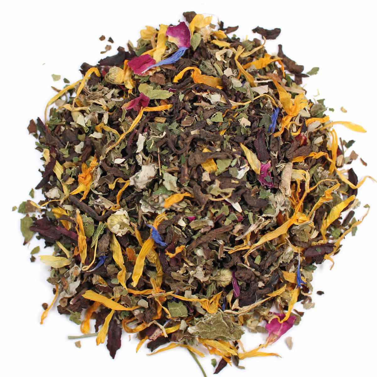 Zutaten: Schawarztee Ceylon, Roter Tee, Hibiskus, Brennnesselblätter, Brombeerblätter, Himbeerblätter, Kamillenblüten, Ringelblumenblüten, Rosenblüten, Kornblumen blau