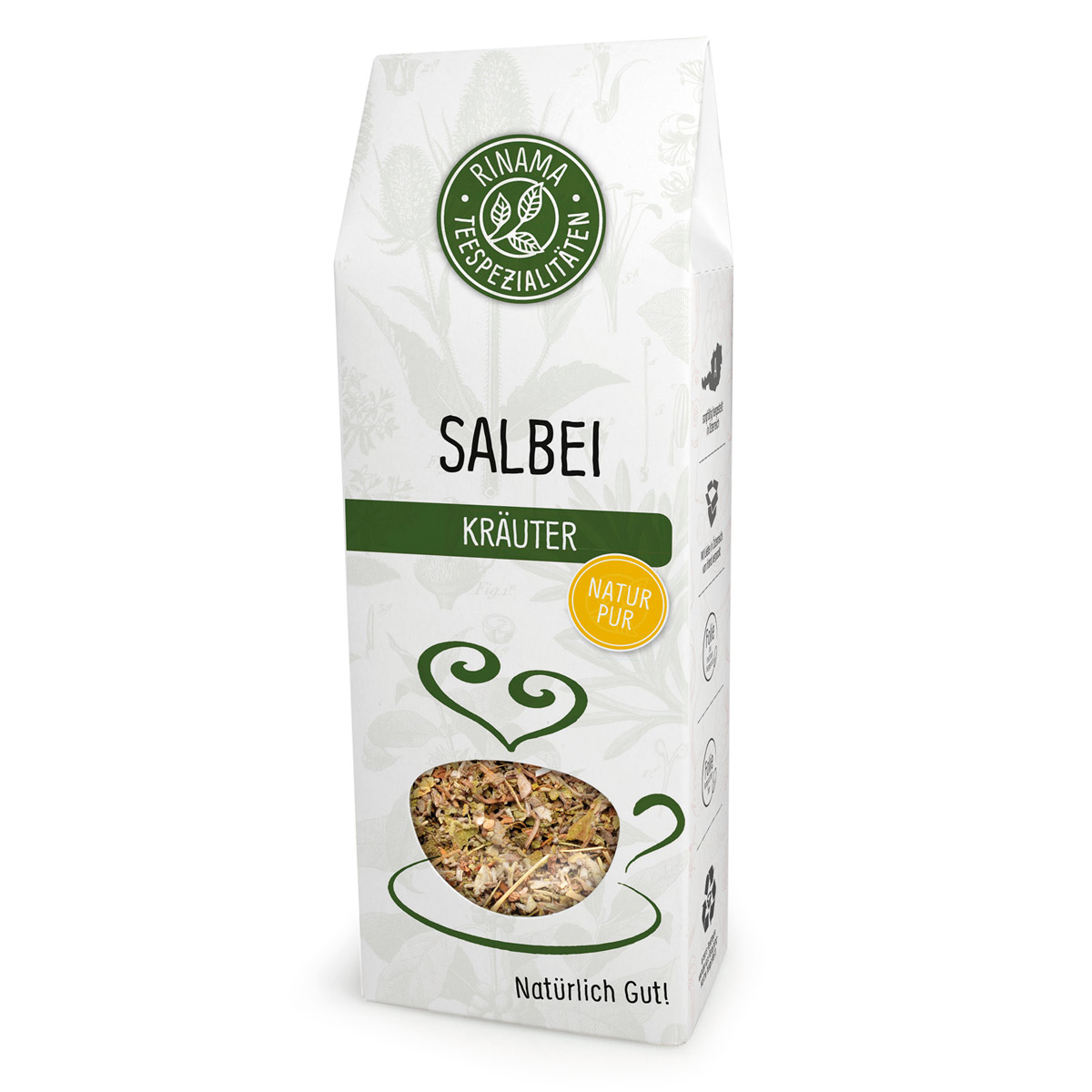 Salbei (Salvia officinalis) ist als Heilpflanze und als aromatisches Gewürz bekannt. Der aromatisch riechende Halbstrauch gehört zu den Lippenblütlern und stammt aus dem Mittelmeergebiet. Durch die schonende Verarbeitung wird ein hoher Anteil natürlicher ätherischer Öle bewahrt. Salbeitee schmeckt köstlich würzig und hat ein ganz leicht bitteres Aroma. Nicht nur in der Erkältungszeit wird der wohlschmeckende Tee gerne getrunken. Eine schonende Verarbeitung bewahrt einen hohen Anteil natürlicher ätherischer Öle.
