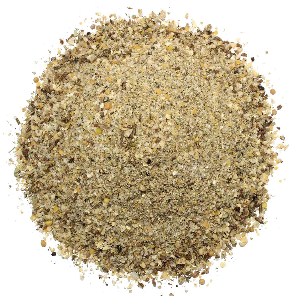 Zutaten: Meersalz (25%), Zwiebel, Knoblauch, Paprika, Kümmel, SENF, Pfeffer, Koriander, Rosmarin, Thymian, Wacholderbeeren, Lorbeerblätter