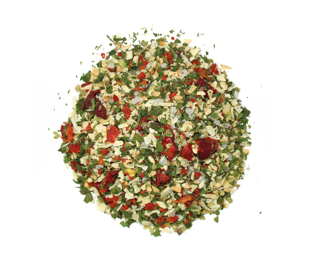 Zutaten: Zwiebeln, Knoblauch, Paprika, Meersalz, Petersilie, Chili, Oregano