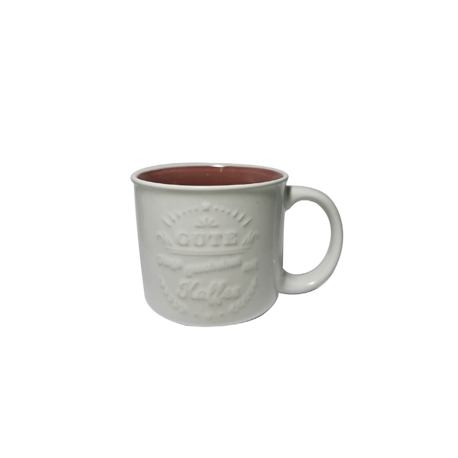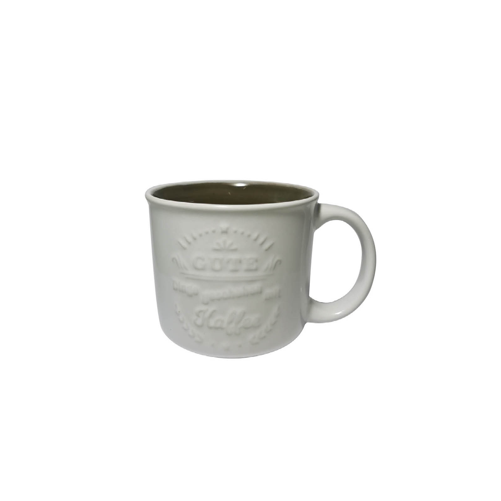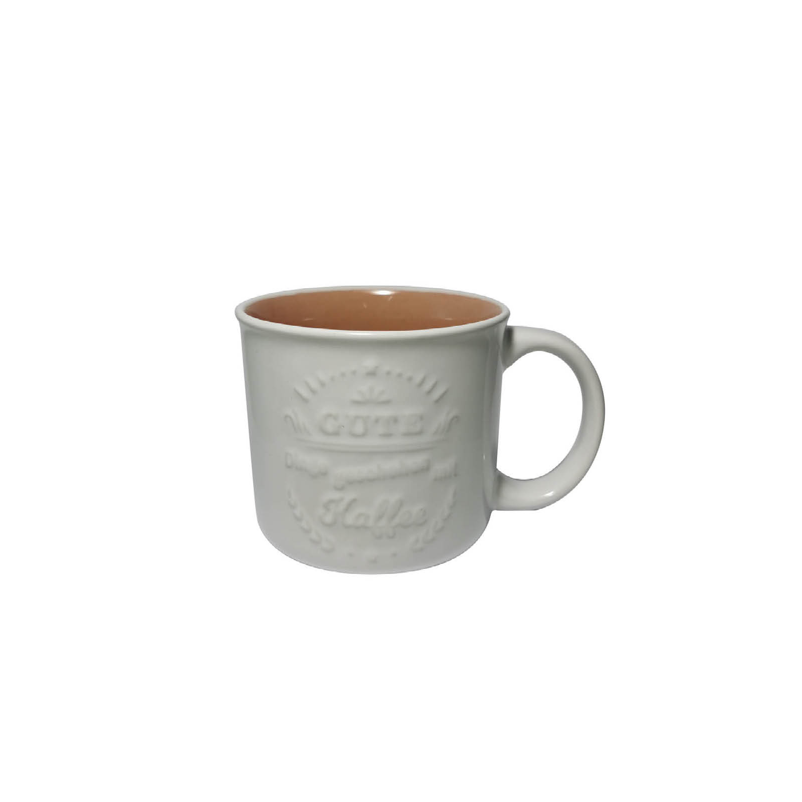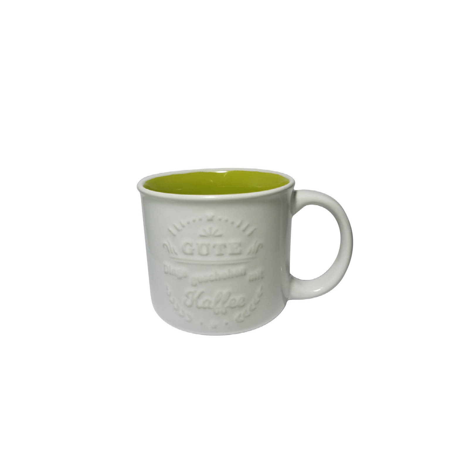 Steingut Becher 410ml handdekoriert 4 Innenfarben sortiert "Gute Dinge passieren mit KAFFEE"